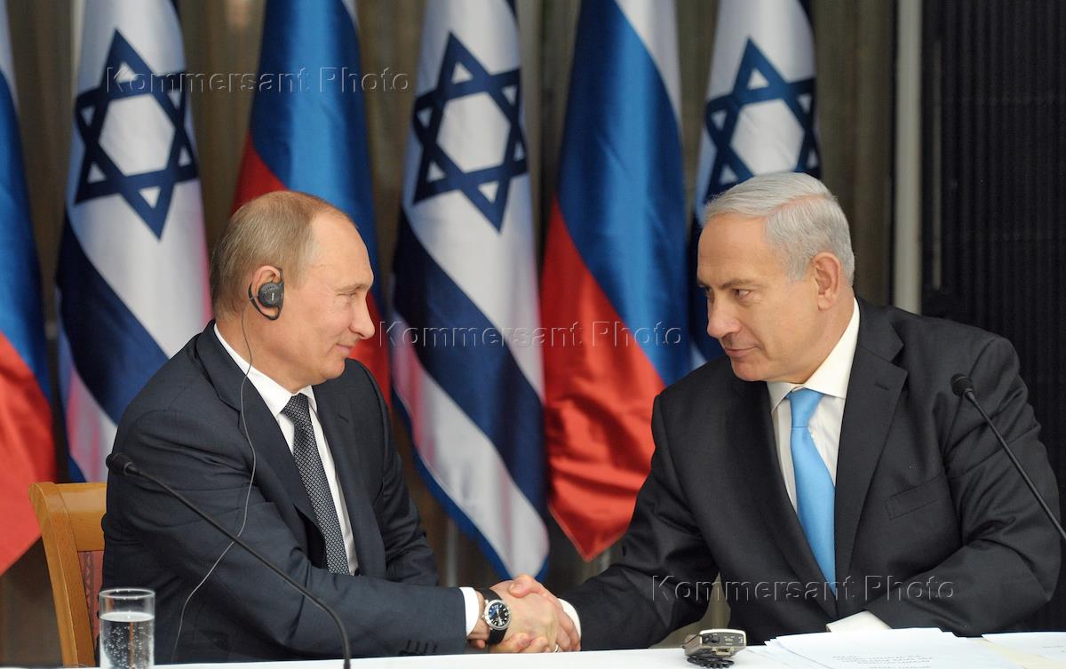 Президент России Владимир Путин (слева) и премьер-министр Израиля Биньямин Нетаньяху (справа) во время заявления для прессы в резиденции премьер-министра Израиля.