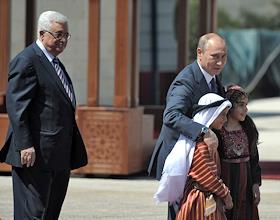 Президент России Владимир Путин (в центре) и глава палестинской администрации Махмуд Аббас (слева) во время официальной церемонии встречи в резиденции главы Палестинской национальной администрации в городе Вифлеем.