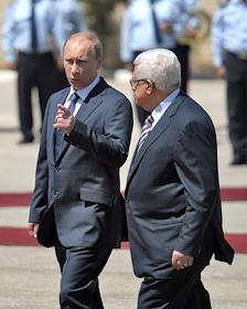 Президент России Владимир Путин (справа) и глава палестинской администрации Махмуд Аббас (слева) во время официальной церемонии встречи в резиденции главы Палестинской национальной администрации в городе Вифлеем.