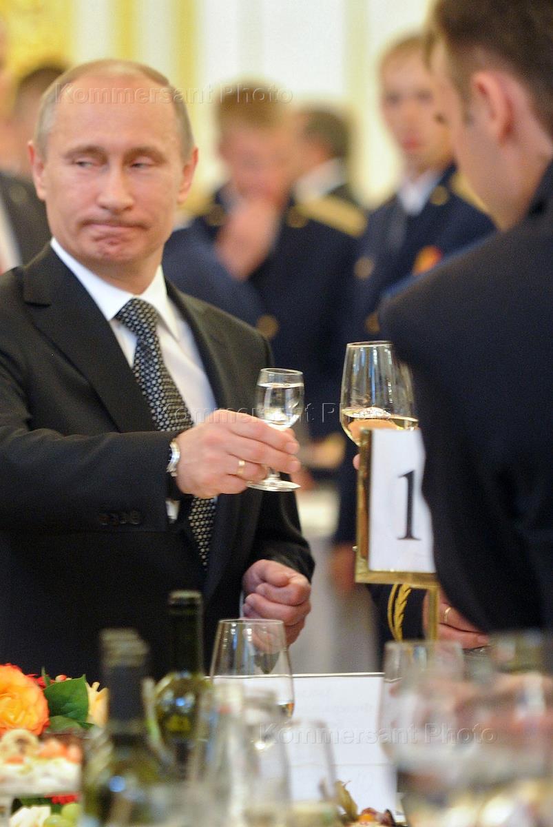 Президент России Владимир Путин (справа) во время встречи с выпускниками военных академий и университетов на торжественном приеме в Кремле.