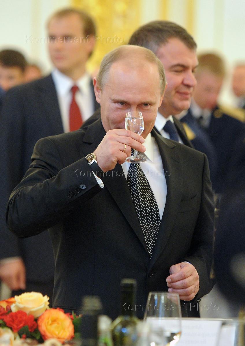 Министр обороны России Анатолий Сердюков (в центре) и президент России Владимир Путин (справа) на приеме в честь выпускников военных академий и университетов. Прием прошел в Кремле.