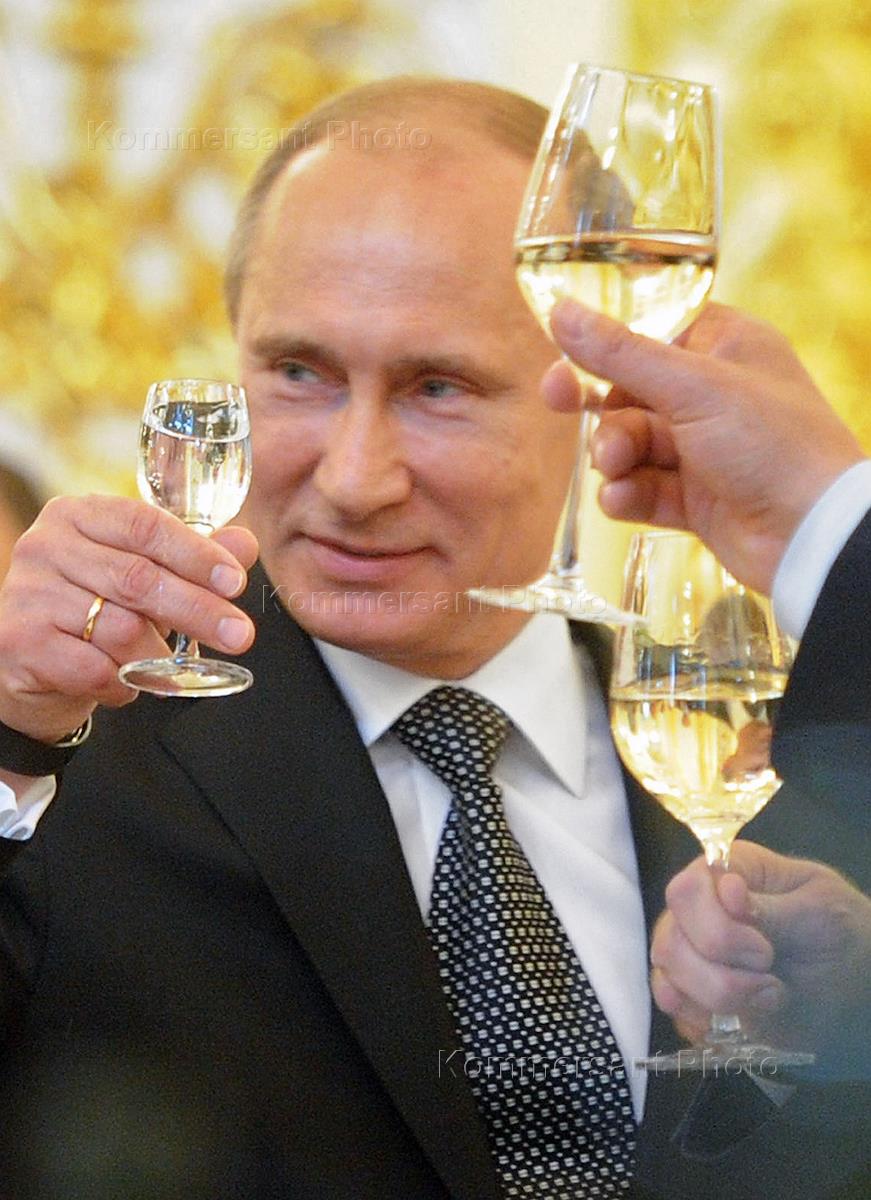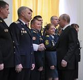 Президент России Владимир Путин (справа) во время встречи с выпускниками военных академий и университетов на торжественном приеме в Кремле.
