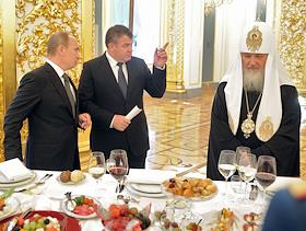 Слева направо: президент России Владимир Путин, министр обороны России Анатолий Сердюков и патриарх Московский и Всея Руси Кирилл на приеме в честь выпускников военных академий и университетов. Прием прошел в Кремле.