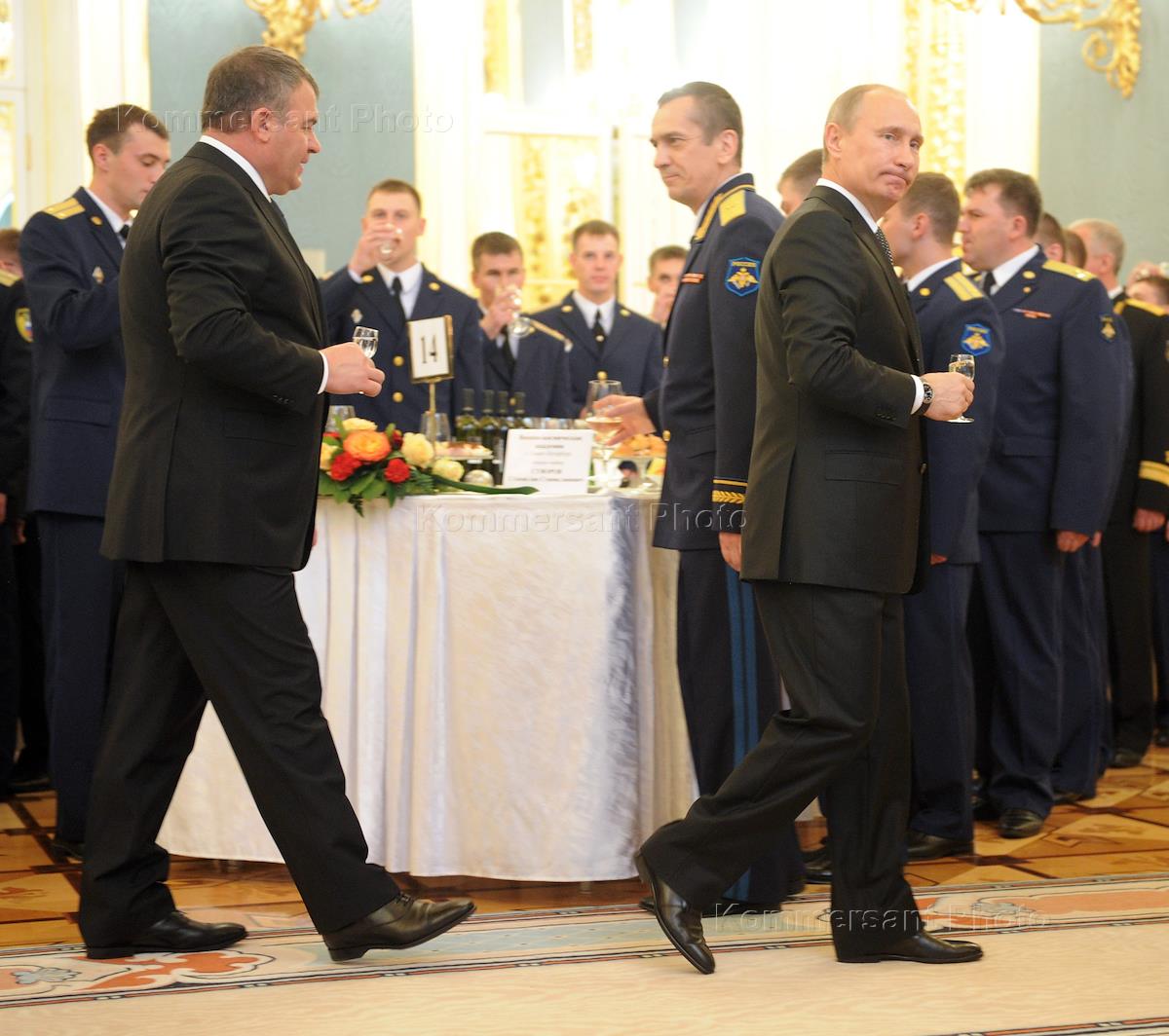 Министр обороны России Анатолий Сердюков (слева) и президент России Владимир Путин (справа) на приеме в честь выпускников военных академий и университетов. Прием прошел в Кремле.