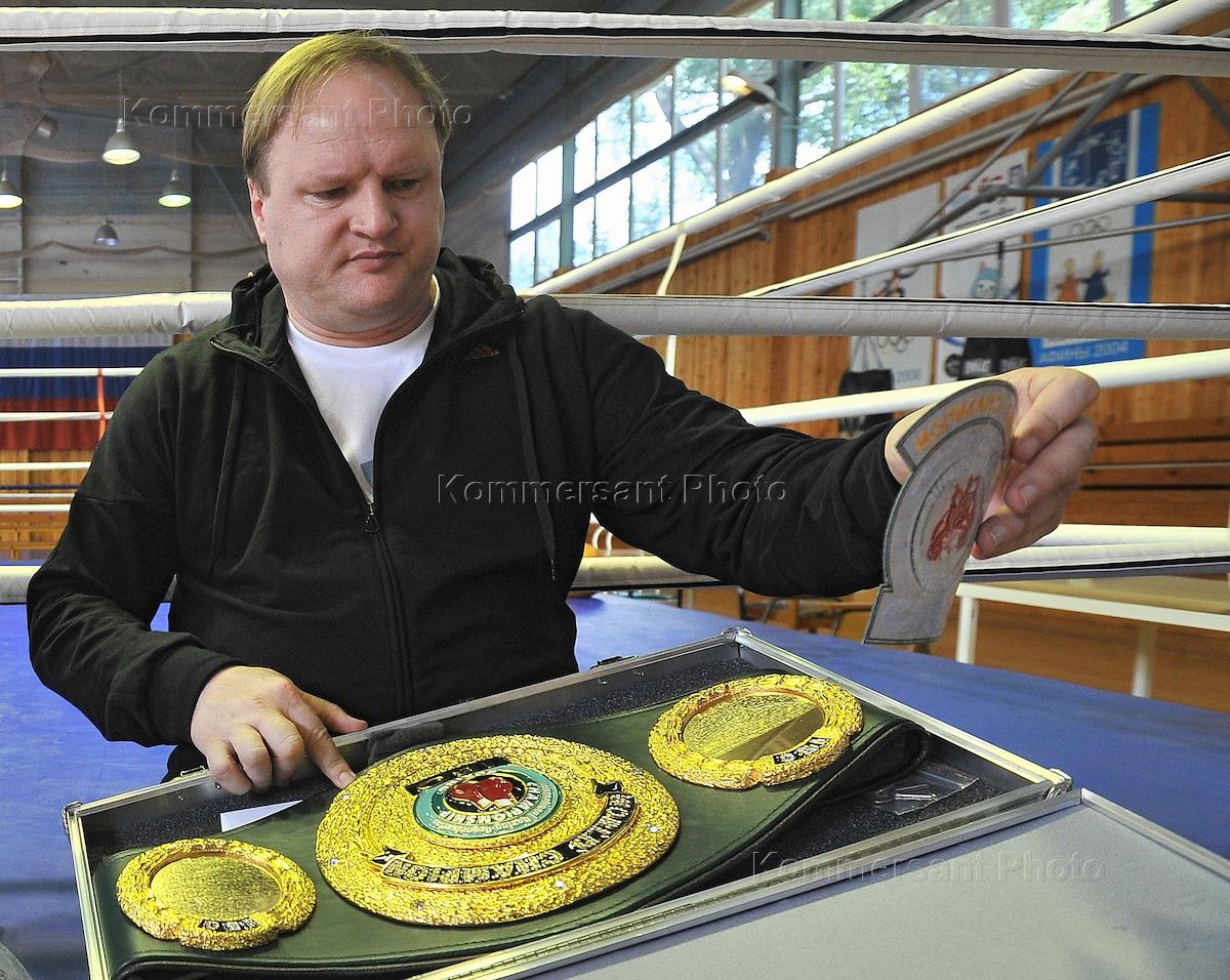 Российский боксер-профессионал Денис Лебедев (слева) и промоутер Владимир Хрюнов (справа) во время тренировки.
