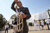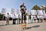 Митинг московских операторов наружной рекламы прошел в Новопушкинском сквере. Участник митинга на стуле "с петлей Черникова".