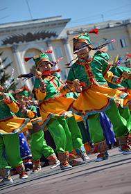 Автопробег "Пекин - Москва 2012". Этап I. Дети в Бурятских национальных костюмах встречают участников автопробега в городе Улан-Уде.