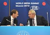 Всемирный медиа саммит под девизом: "Мировые медиа: вызовы XXI века" прошел в Центре международной торговли (ЦМТ). Генеральный директор ИТАР-ТАСС, председатель Оргкомитета саммита Виталий Игнатенко (слева) и председатель Государственной думы России Сергей Нарышкин (справа) во время саммита.