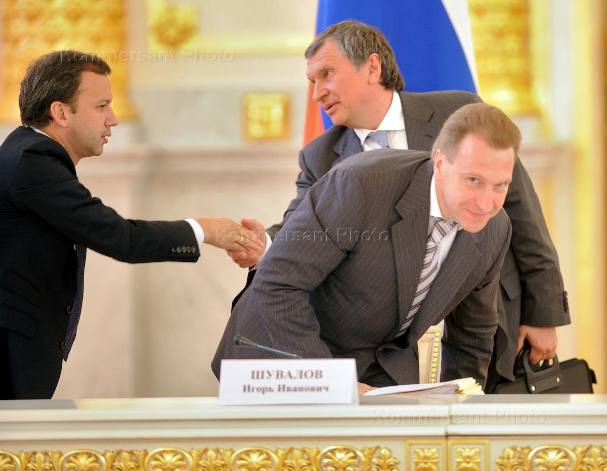 Слева направо: аместитель председателя правительства России Аркадий Дворкович, президент НК "Роснефть" Игорь Сечин и первый заместитель председателя правительства России Игорь Шувалов на заседании Комиссии при президенте России по вопросам стратегии развития топливно-энергетического комплекса и экологической безопасности (ТЭК). Заседание прошло в Александровском зале Большого Кремлевского Дворца.