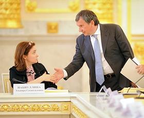 Помощник президента России Эльвира Набиуллина (слева) и президент НК "Роснефть" Игорь Сечин (справа) на заседании Комиссии при президенте России по вопросам стратегии развития топливно-энергетического комплекса и экологической безопасности (ТЭК). Заседание прошло в Александровском зале Большого Кремлевского Дворца.