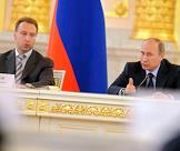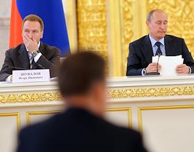 Первый заместитель председателя правительства России Игорь Шувалов (слева) и президент России Владимир Путин (справа) на заседании Комиссии при президенте России по вопросам стратегии развития топливно-энергетического комплекса и экологической безопасности (ТЭК). Заседание прошло в Александровском зале Большого Кремлевского Дворца.