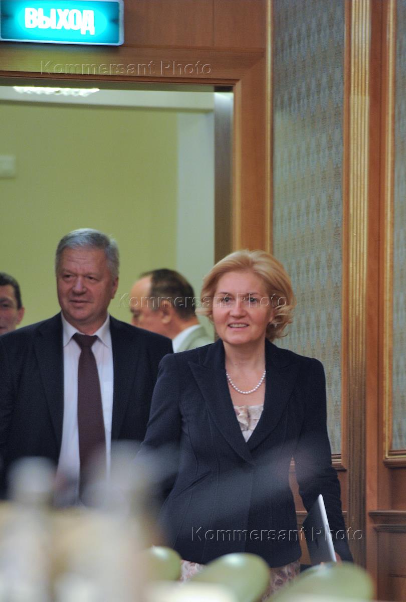Председатель Федерации независимых профсоюзов Михаил Шмаков (слева) и заместитель председателя правительства России Ольга Голодец (справа) на заседании Российской трехсторонней комиссии по регулированию социально-трудовых отношений. Заседание прошло в Доме правительства России.