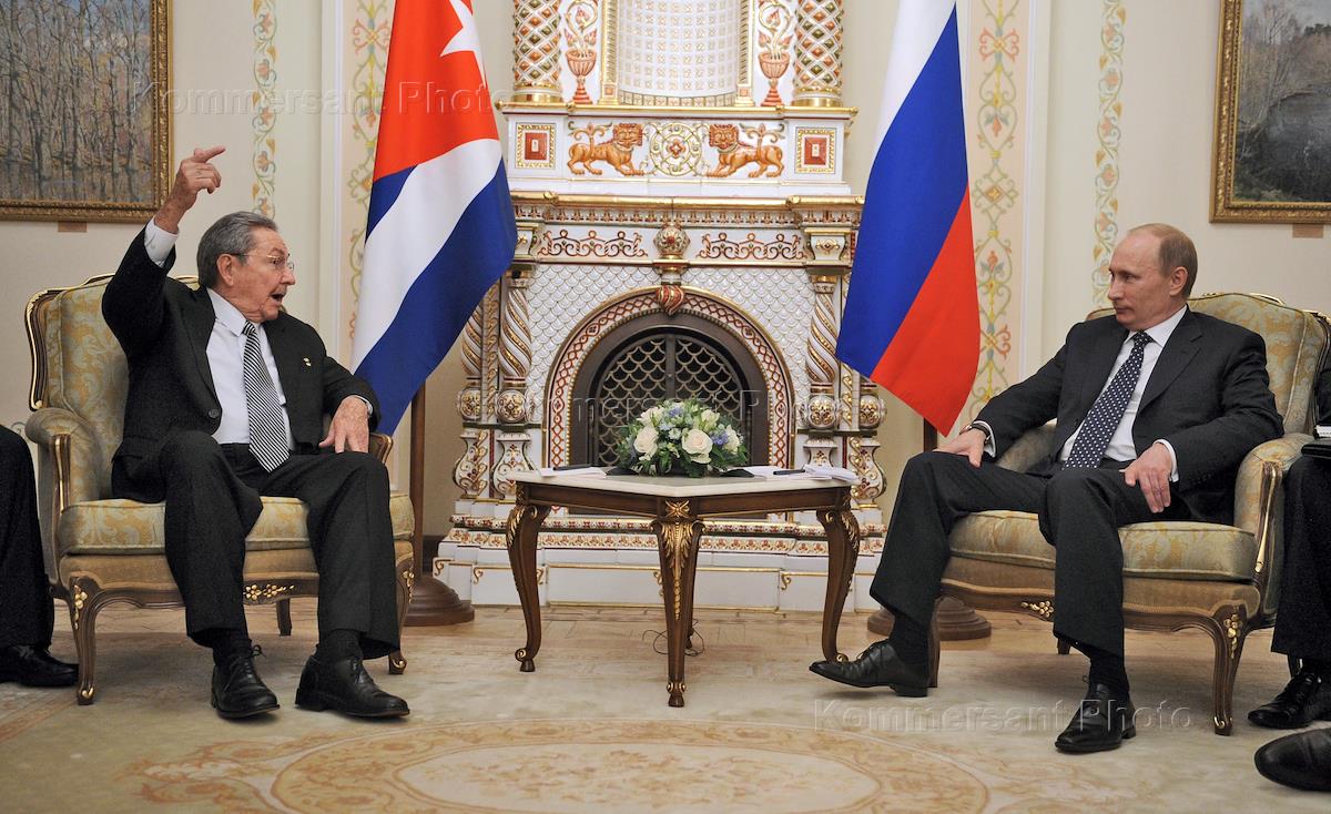 Слева направо: президент России Владимир Путин, министр иностранных дел России Сергей Лавров и председатель Госсовета и Совета министров Кубы Рауль Кастро во время встречи в Ново-Огарево.
