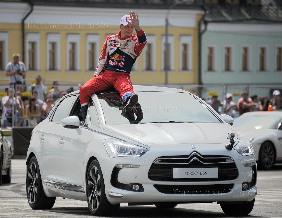 Пятое юбилейное автомобильное шоу Moscow City Racing 2012 прошло в центре Москвы. Гонщик Микко Хировонен (WRC Citroen) во время парада участников.