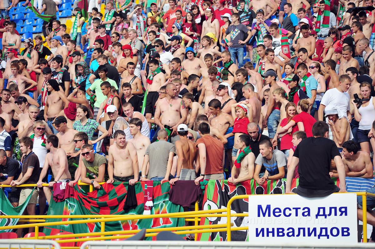 Суперкубок России по футболу 2012. Болельщики команды "Рубин" (Казань) на трибуне во время матча между командами "Зенит" (Санкт-Петербург) и "Рубин" (Казань). Матч прошел на стадионе "Металлург". Табличка "Места для инвалидов".