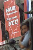 Выборы губернатора Красноярского края. Во второй тур вышли спикер местного законодательного собрания Александр Усс и губернатор Таймыра Александр Хлопонин. Разрыв между ними составил всего около 2%. Рекламный плакат Александра Усса на здании города.