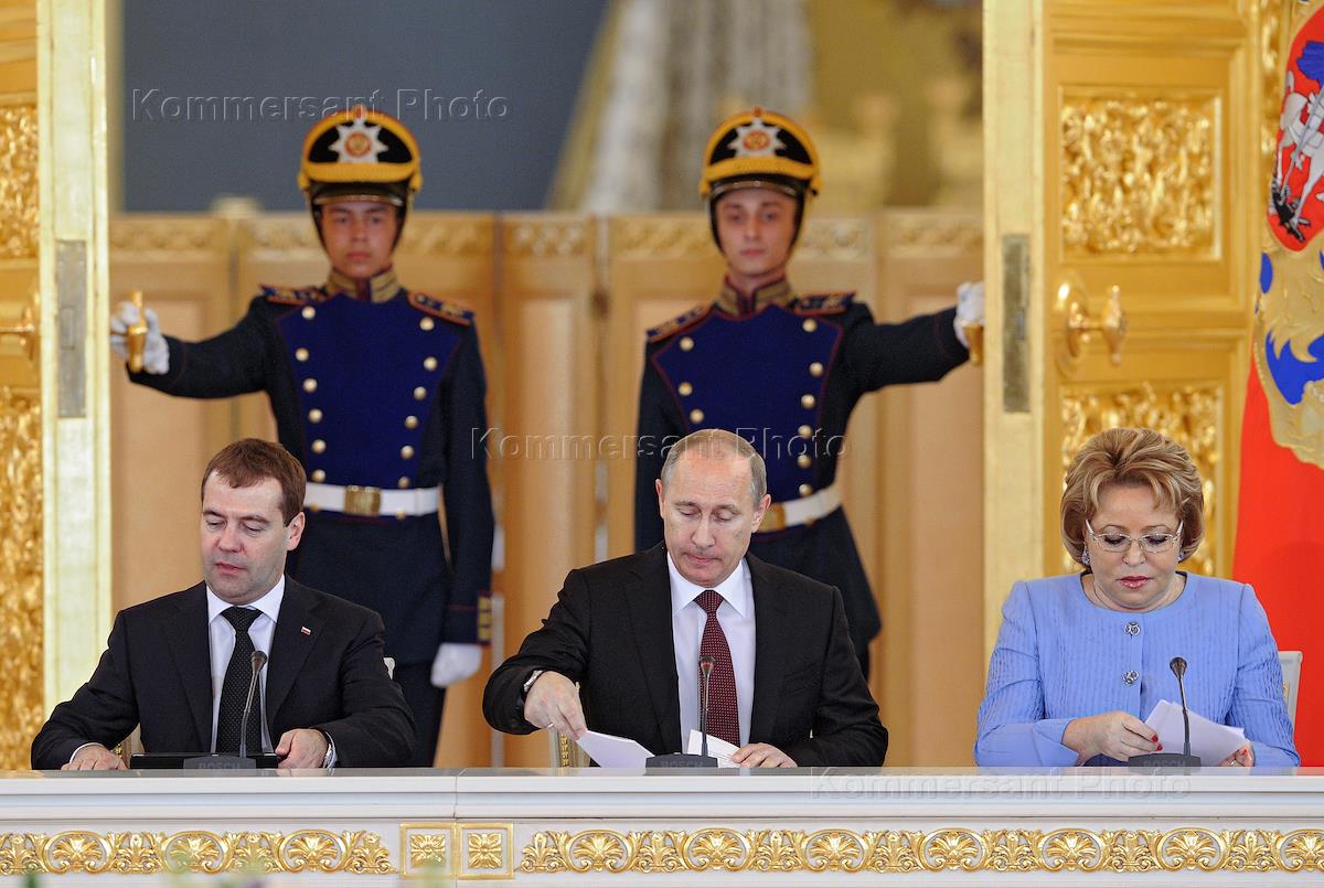 Первое заседание Государственного совета в обновленном составе. Слева направо: председатель правительства России Дмитрий Медведев, президент России Владимир Путин и председатель Совета Федерации России Валентина Матвиенко во время заседания в Кремле.