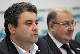 Лидер Демократической партии России Андрей Богданов (слева) и лидер Социал-демократической партии России Виктор Милитарев (справа) на пресс-конференции лидеров пяти новых партий. Пресс-конференция на тему: "Подготовка к осенним региональным и муниципальным выборам" прошла в центральном офисе агентства "Интерфакс".