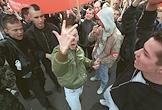 A participant of the ultra-left rally 'Anti-Capitalism 2002' points his arse at the police cordon in front of the National Bolshevik Party banner.