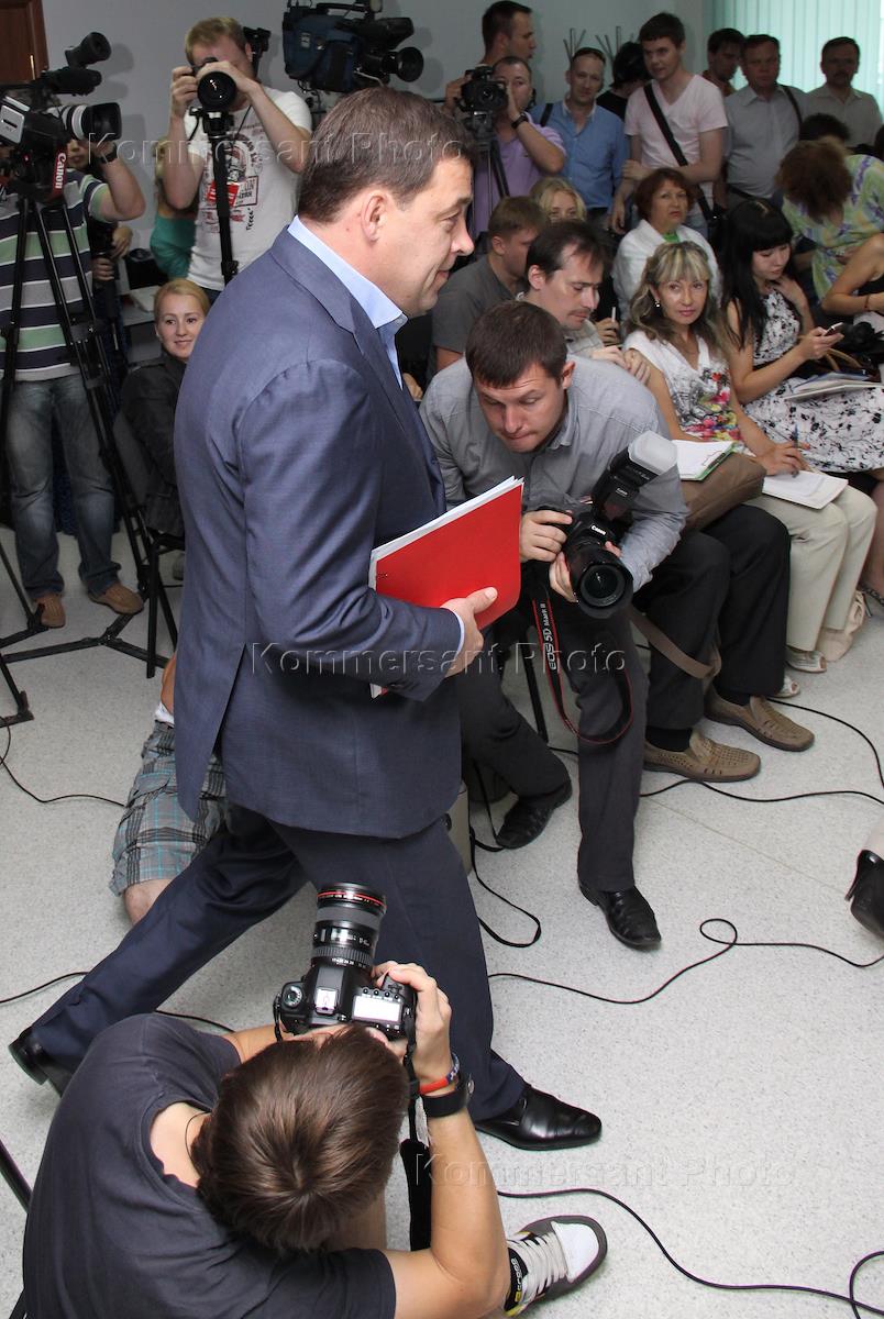 Губернатор Свердловской области Евгений Куйвашев во время пресс-конференции, посвященной итогам прошедшей выставки промышленности и инноваций "Иннопром 2102". Пресс-конференция прошла в пресс-центре агентства "Интерфакс-Урал".