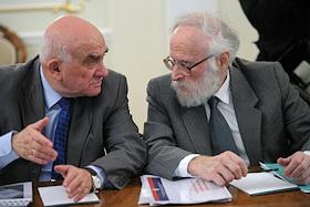 Экономист, научный руководитель Государственного Университета "Высшая школа экономики" Евгений Ясин (слева) и академик Российской академии наук Револьд Энтов (справа) во время заседания Экономического совета при президенте России. Первое заседание прошло в Ново-Огарево.