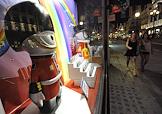 XXX Летние Олимпийские игры. Фигурки символов Олимпиады - Уэлнока и Мандевиля в форме королевского гвардейца и биффитора в витрине магазина.