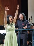 Оперная певица Анна Нетребко (слева) во время выступления на гала-концерте на сцене Мариинского театра.