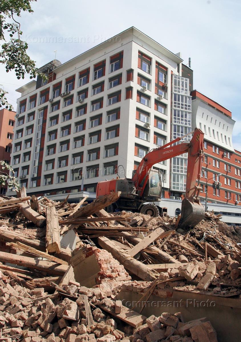 Excavator on a pile of rubble of historical building at the corner of Studenaya and Gorky.