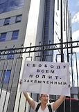 Женщина держит плакат с надписью "Свободу всем политзаключенным" у здания Следственного комитета России, куда он был вызван гражданский активист, блогер Алексей Навальный для предъявления ему официального обвинения по "делу Кировлеса".