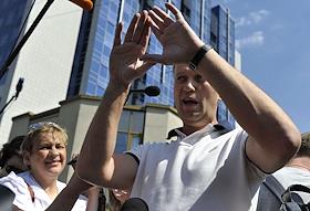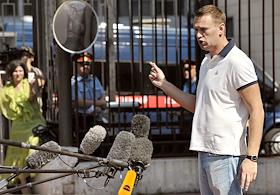 Гражданский активист, блогер Алексей Навальный (справа) у Следственного комитета России, куда он был вызван для предъявления ему официального обвинения по "делу Кировлеса".