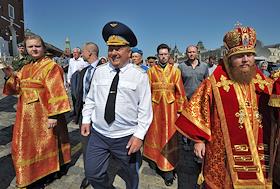Праздничные мероприятия, посвященные дню Воздушно-десантных войск России. Председатель Центральной избирательной комиссии России Владимир Чуров (слева) во время Крестного хода от храма пророка Илии по улице Ильинка на Красную площадь.