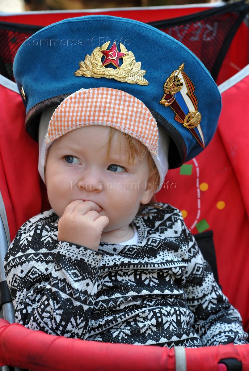Праздничные мероприятия, посвященные дню Воздушно-десантных войск России. Ребенок в форме десантника у храма пророка Божьего Илии на Ильинке.