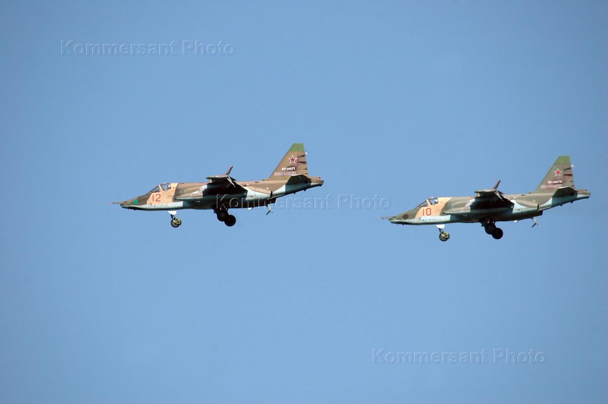 Подготовка летных экипажей Военно-воздушных сил (ВВС) к участию в демонстрационных полетах на авиационном празднике "Общее небо", к 100-летию ВВС, прошла на аэродроме "Чкаловский". Самолеты Су-25СМ во время посадки парой.