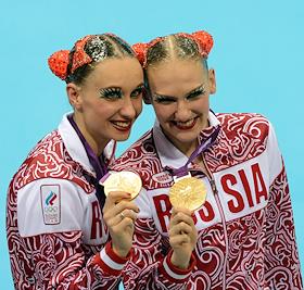 XXX Летние Олимпийские игры в Лондоне. Члены Олимпийской сборной России по синхронному плаванию Светлана Ромашина и Наталья Ищенко на церемонии награждения победителей. Спортсменки Светлана Ромашина и Наталья Ищенко выиграли золотые медали по синхронному плаванию.