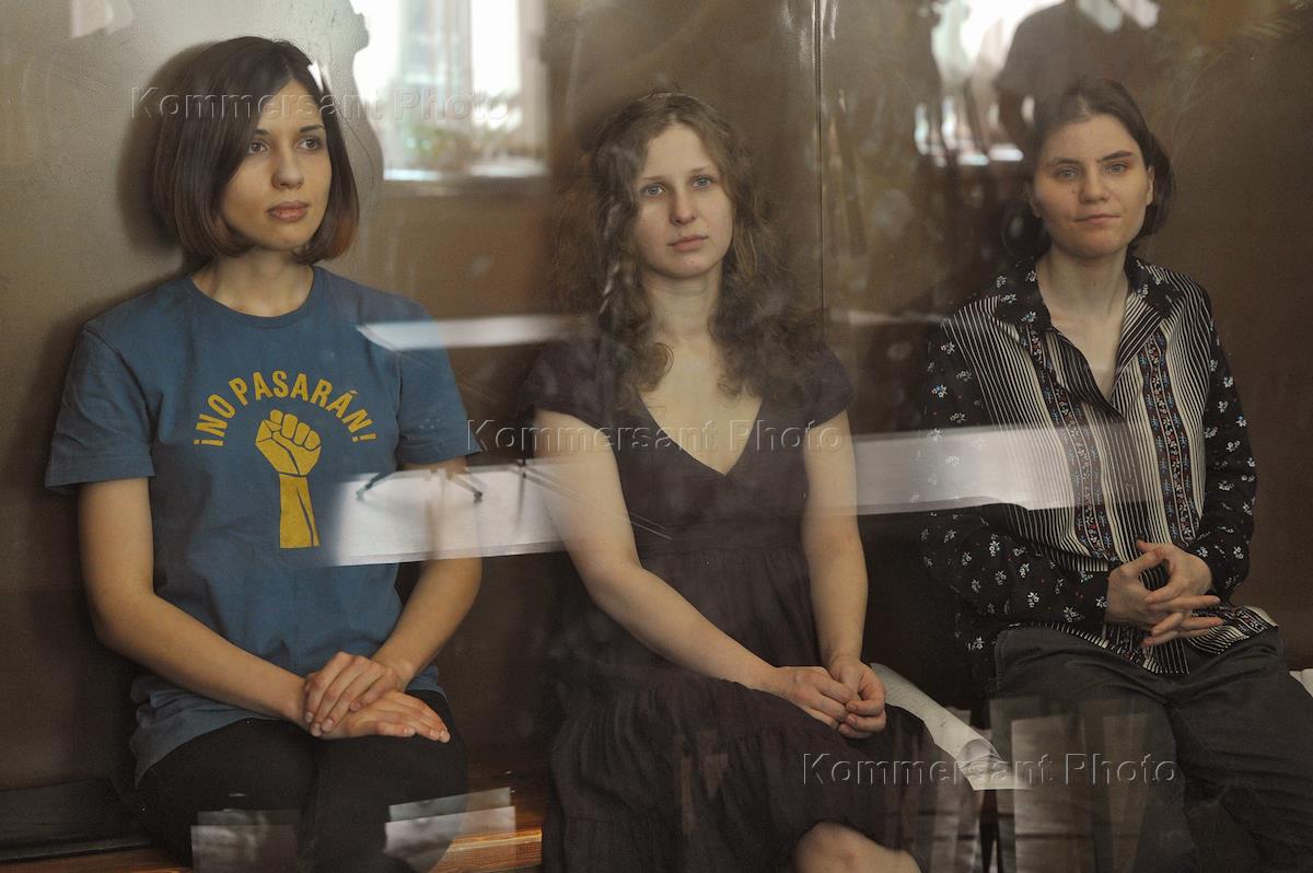 Участницы панк-группы Pussy Riot слева направо: Надежда Толоконникова, Мария Алехина и Екатерина Самуцевич, обвиняемые в хулиганстве в Храме Христа Спасителя, на заседании суда по их делу в Хамовническом суде.