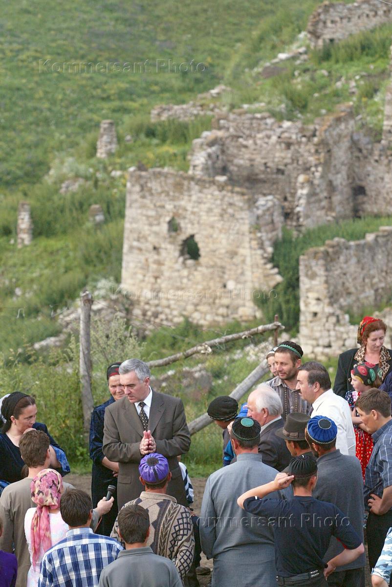 Residents of the Assinovskoye Gorge meet Russian republic of Ingushetiya President Murat Zyazikov.