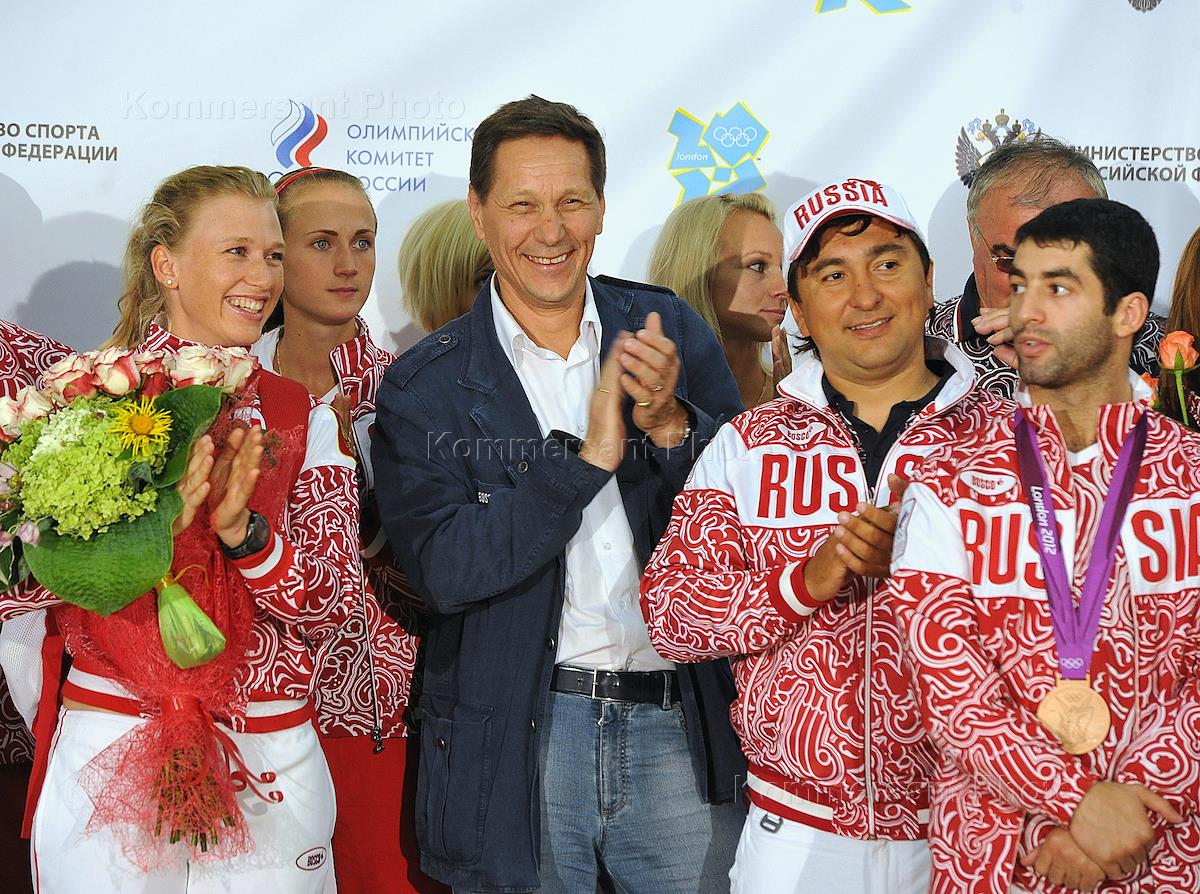 Члены Олимпийской сборной России Сергей Тетюхин (слева), Миша Алоян (четвертый справа), Давид Айрапетян (второй справа), президент Олимпийского комитета России, первый заместитель председателя Государственной думы России Александр Жуков (в центре) и министр спорта России Виталий Мутко (справа) во время церемонии торжественной встречи официальной олимпийской делегации с XXX Летних Олимпийских игр в Лондоне. Церемония прошла в аэропорту "Шереметьево" в терминале D.