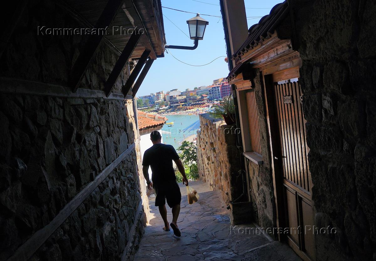 Жанровая фотография. Виды города Созополь. Мужчина на качелях на детской площадке.