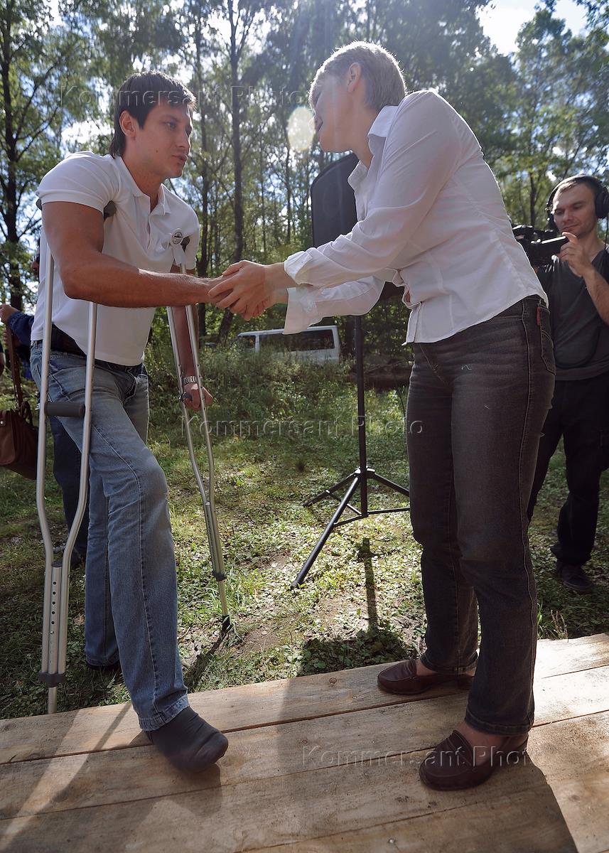 Лидер движения по защите Химкинского леса Евгения Чирикова (справа) и член комитета Государственной думы по физической культуре, спорту и делам молодежи Дмитрий Гудков (слева) на открытии дискуссионного лагеря "Центр", где будет решаться вопрос о выдвижении "народного" кандидата на должность мэра города Химки.