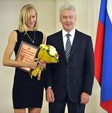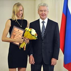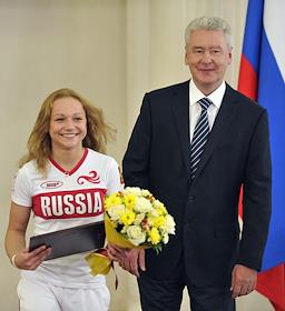 Член олимпийской сборной России по легкой атлетике Светлана Школина (слева) и мэр Москвы Сергей Собянин (справа) во время торжественной церемонии награждения московских спортсменов - победителей и призеров ХХХ Олимпийских игр в Лондоне. Церемония прошла в Белом зале Мэрии.