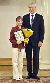Член олимпийской сборной России по художественной гимнастике Ульяна Донскова (слева) и мэр Москвы Сергей Собянин (справа) во время торжественной церемонии награждения московских спортсменов - победителей и призеров ХХХ Олимпийских игр в Лондоне. Церемония прошла в Белом зале Мэрии.