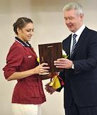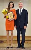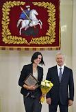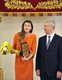 Член олимпийской сборной России по художественной гимнастике Евгения Канаева (слева) и мэр Москвы Сергей Собянин (справа) во время торжественной церемонии награждения московских спортсменов - победителей и призеров ХХХ Олимпийских игр в Лондоне. Церемония прошла в Белом зале Мэрии.
