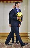 Член олимпийской сборной России по греко-римской борьбе Алан Хугаев (справа) и мэр Москвы Сергей Собянин (слева) во время торжественной церемонии награждения московских спортсменов - победителей и призеров ХХХ Олимпийских игр в Лондоне. Церемония прошла в Белом зале Мэрии.