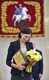 Член олимпийской сборной России по легкой атлетике Наталья Антюх (слева) и мэр Москвы Сергей Собянин (справа) во время торжественной церемонии награждения московских спортсменов - победителей и призеров ХХХ Олимпийских игр в Лондоне. Церемония прошла в Белом зале Мэрии.