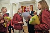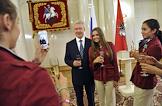 Члены олимпийской сборной России по художественной гимнастике Каролина Севастьянова (в центре), Анастасия Назаренко (справа) и мэр Москвы Сергей Собянин (слева) во время торжественной церемонии награждения московских спортсменов - победителей и призеров ХХХ Олимпийских игр в Лондоне. Церемония прошла в Белом зале Мэрии.
