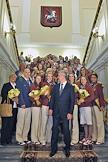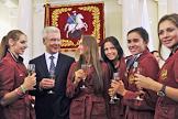 Члены олимпийской сборной России по синхронному плаванию Анжелика Тиманина (слева), Светлана Ромашина (вторая слева), Александра Пацкевич (справа) и мэр Москвы Сергей Собянин (второй справа) во время торжественной церемонии награждения московских спортсменов - победителей и призеров ХХХ Олимпийских игр в Лондоне. Церемония прошла в Белом зале Мэрии.