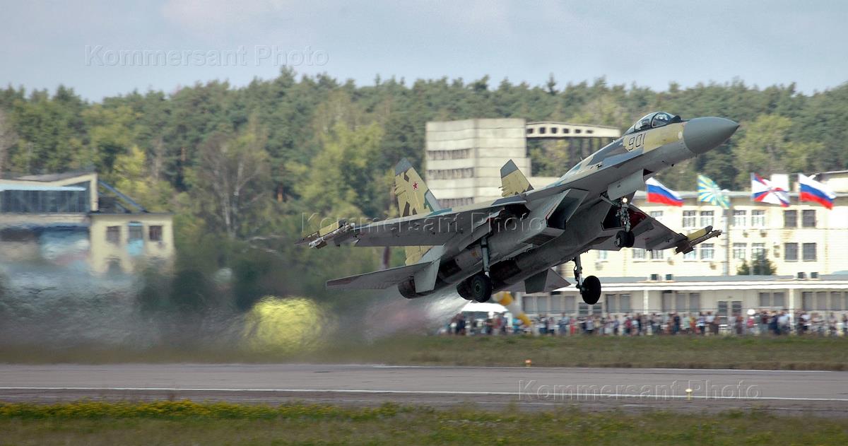 Тренировка перед авиационным праздником в честь 100-летия Военно-воздушных сил (ВВС) России. Тренировка и праздник прошли на аэродроме в Жуковском. Самолет Су-35.