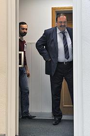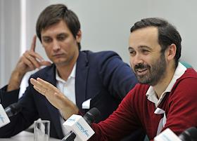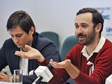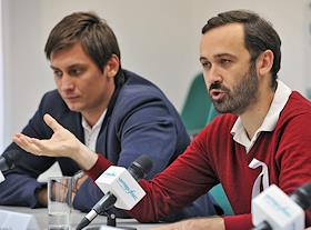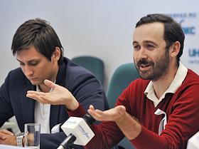 Член комитета Государственной думы (ГД) России по физической культуре, спорту и делам молодежи Дмитрий Гудков (слева) и член комитета ГД по экономической политике, инновационному развитию и предпринимательству Илья Пономарев (справа) на пресс-конференции "Политические репрессии в современной России. Создание движения против репрессий "Анти-ГУЛАГ". Пресс-конференция прошла в агентстве "Интерфакс".