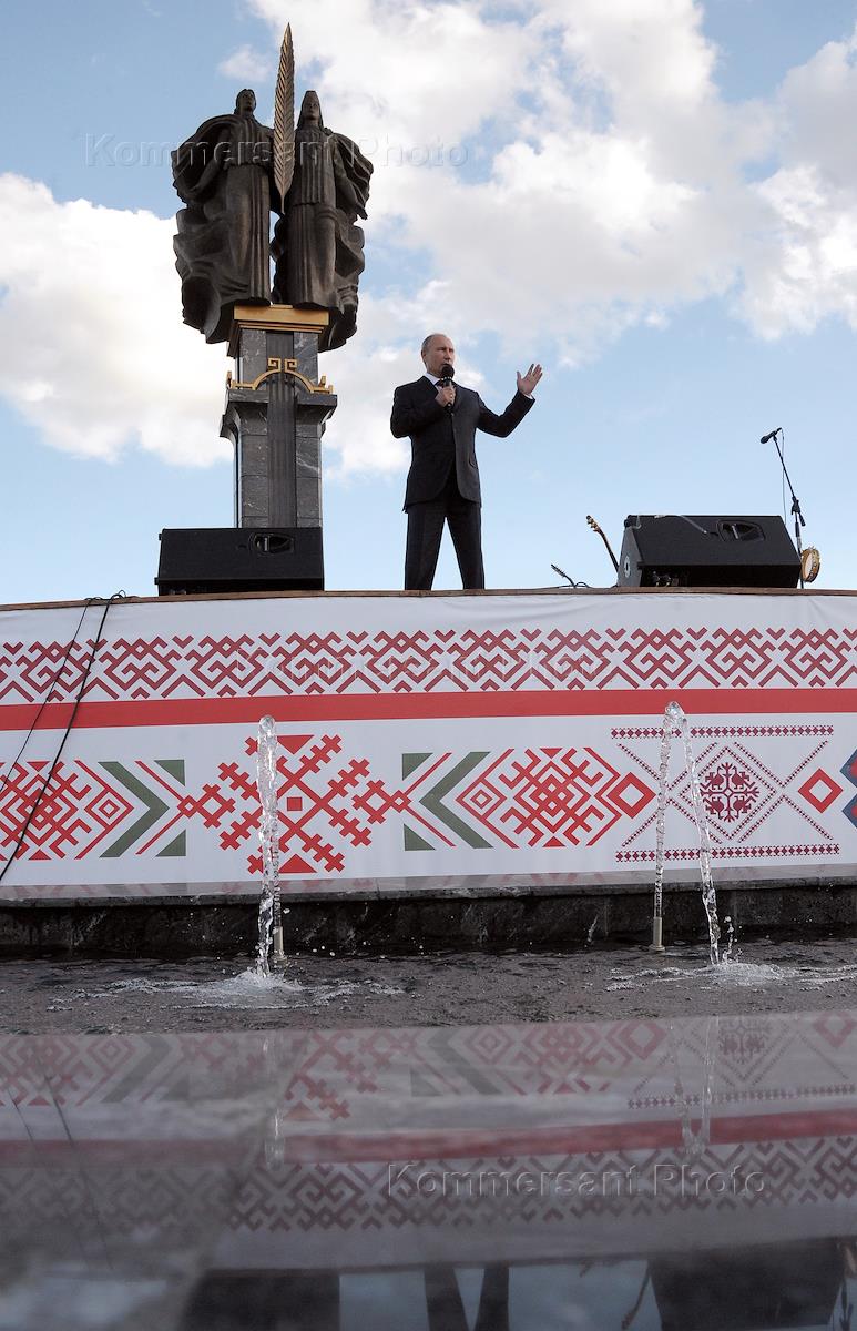 Рабочая поездка президента России Владимира Путина в Саранск. Президент России Владимир Путин (слева) во время праздничных мероприятий, посвященных тысячелетию единения мордовского народа с народами российского государства. Торжественные мероприятия прошли на Соборной площади.