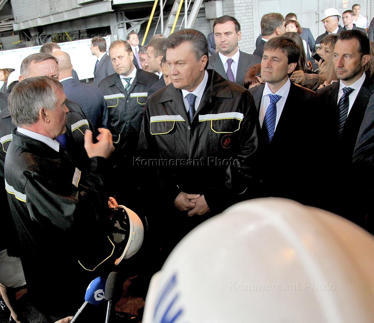 Рабочая поездка президента Украины Виктора Януковича в Донецкую область. Президент Украины Виктор Янукович (в центре) во время посещения Донецкого металлургического завода.